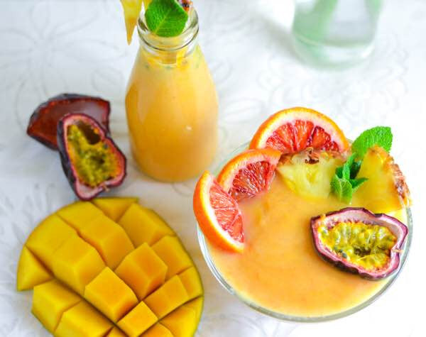 “Gooood morning!!! Today I wanted to share with you this delicious pic and recipe for my latest smoothie invention. This is a vegan tropical shake that I made with mangoes, pineapple, almond milk, carrots, @minvitauk baobab and passion fruit. I have been craving mangoes! I think it’s the Indian in me reminding me that it’s Mango season back in India. I usually avoid eating any other mangoes other than Indian or Pakistani ones in London because the other ones don’t taste like the ones from back home. However, I was in an all time mango craving phase and decided to give a South American mango a try (Asian mangoes will be here only after May!). I was pleasantly surprised, however. I waited till it became very ripe and this mango was bursting with sweet and tangy taste and with a good texture. It was nothing like the mangoes that I was used to but it was filled with a tropical tang and hue and inspired me to make this smoothie bowl! So all in my tropical cravings were satisfied and I had a pretty and tasty smoothie bowl as well! How amazing is that??”