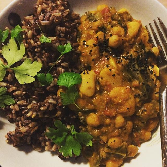 Ingredients1 tin chopped tomatoes3 fresh garlic cloves, crushed1 large onion, finely chopped1 tbsp mild madras curry powder1 tsp dried chilli flakes1 organic vegetable stock cube150ml water2 cups red lentils, rinsed1 tin chickpeas1 tin butter beans1 tsp nigella seeds2 handfuls kale, washedSalt & pepperFor the rice:1 cup Minvita Organic Sprouted GABA Rice Black1 cup brown rice3 cups waterFresh corianderRecipeYou know we get a kick out of sharing guest recipes with you! Anyone who thinks it’s all done by arrangement may be surprised to learn the majority of our guests have just happened to tag us in a mouth-watering shot on social....