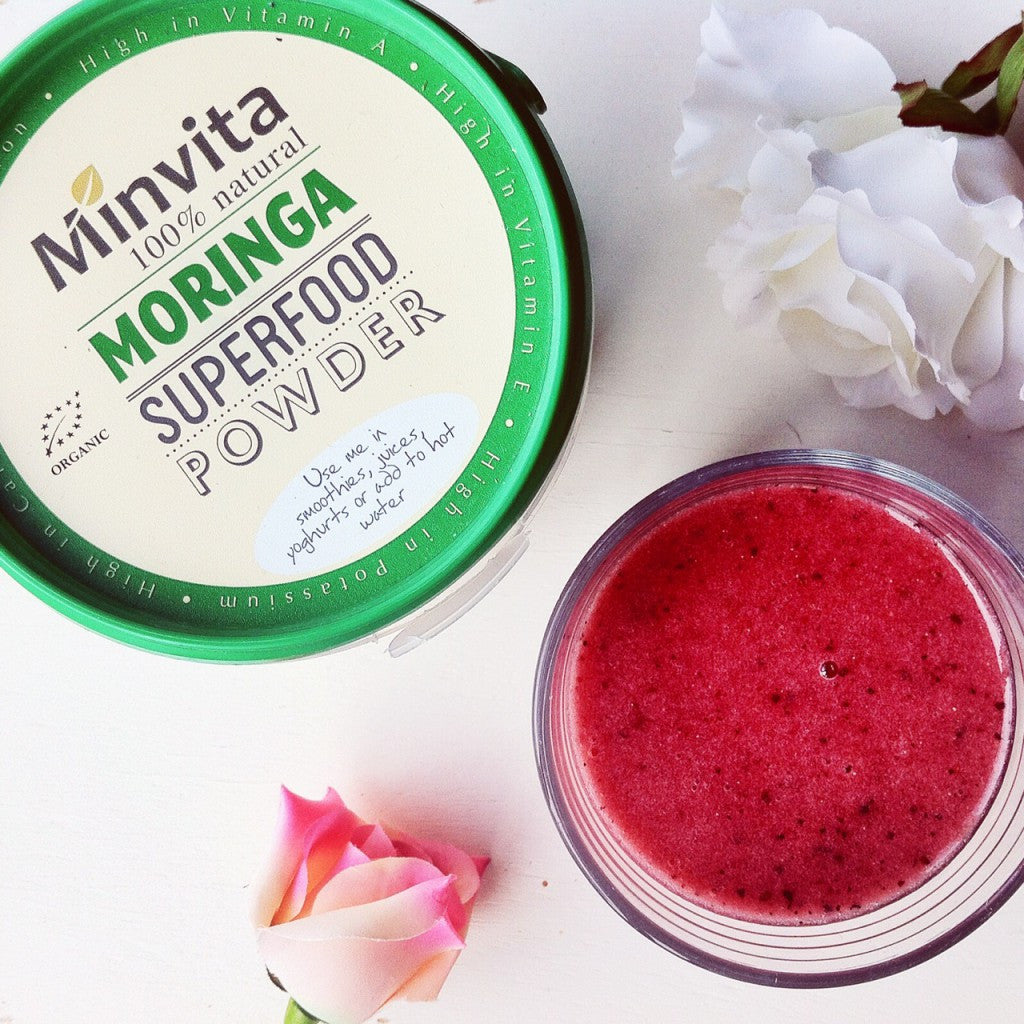 Ingredients1 tbsp Minvita Moringa Superfood Powder1 cup frozen berries (raspberries, blueberries, strawberries, cherries)1 cup water or crushed ice1/2 frozen banana2 kiwis1 pear1 appleRecipeIf you’re in need of some nourishment or want to feel refreshed from the inside out, we highly recommend this rejuvenating smoothie. Our Moringa Superfood Powder is 100% organic and naturally high in Vitamin A, Vitamin E, calcium, iron, magnesium and potassium and helps to support your body’s natural defences, making it perfect for those days when you need a quick boost. A pick me up is coming right up…1. First, pop the frozen fruit into your blended...
